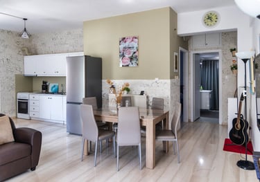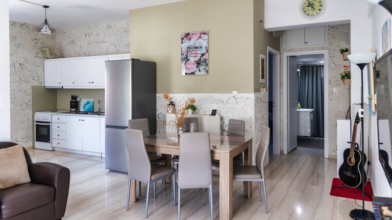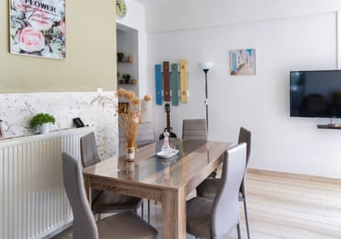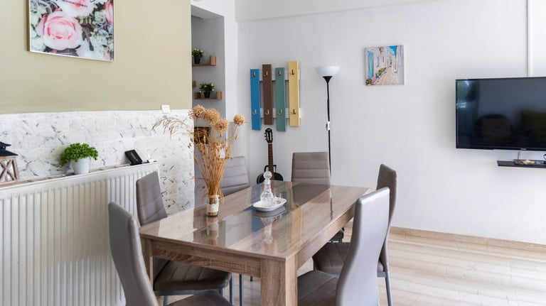 The dining area is spacious and can accommodate up to 6 guests. With its rectangular table and comfortable chairs, it is the ideal place to share a meal with family or friends.