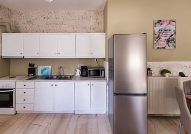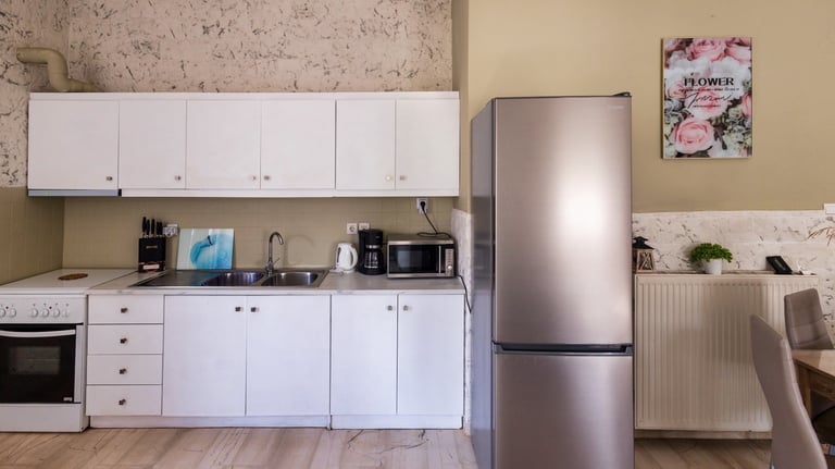 The kitchen is fully equipped with a hob, oven, dishwasher, microwave, electric mixer, kettle and coffee maker, making it possible to prepare delicious meals.