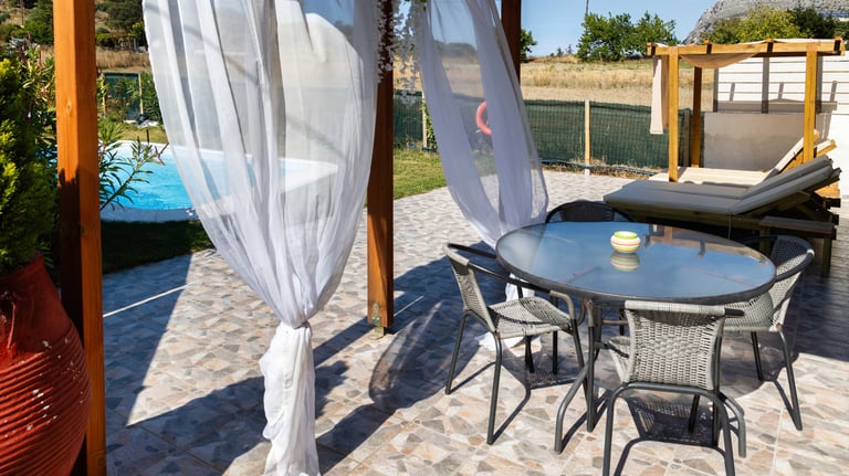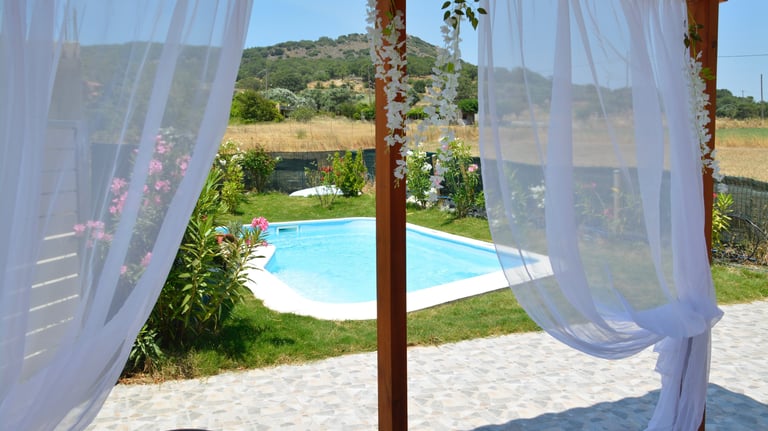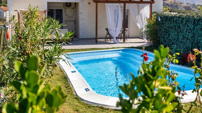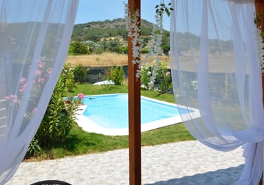 You will find a large terrace with a dining area under the pergola and comfortable deckchairs available. You have private use of the swimming pool and garden