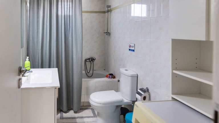 The bathroom is equipped with a shower, a toilet, a washing machine and a storage unit. It is a functional and well-appointed space to meet the daily needs of the whole family.